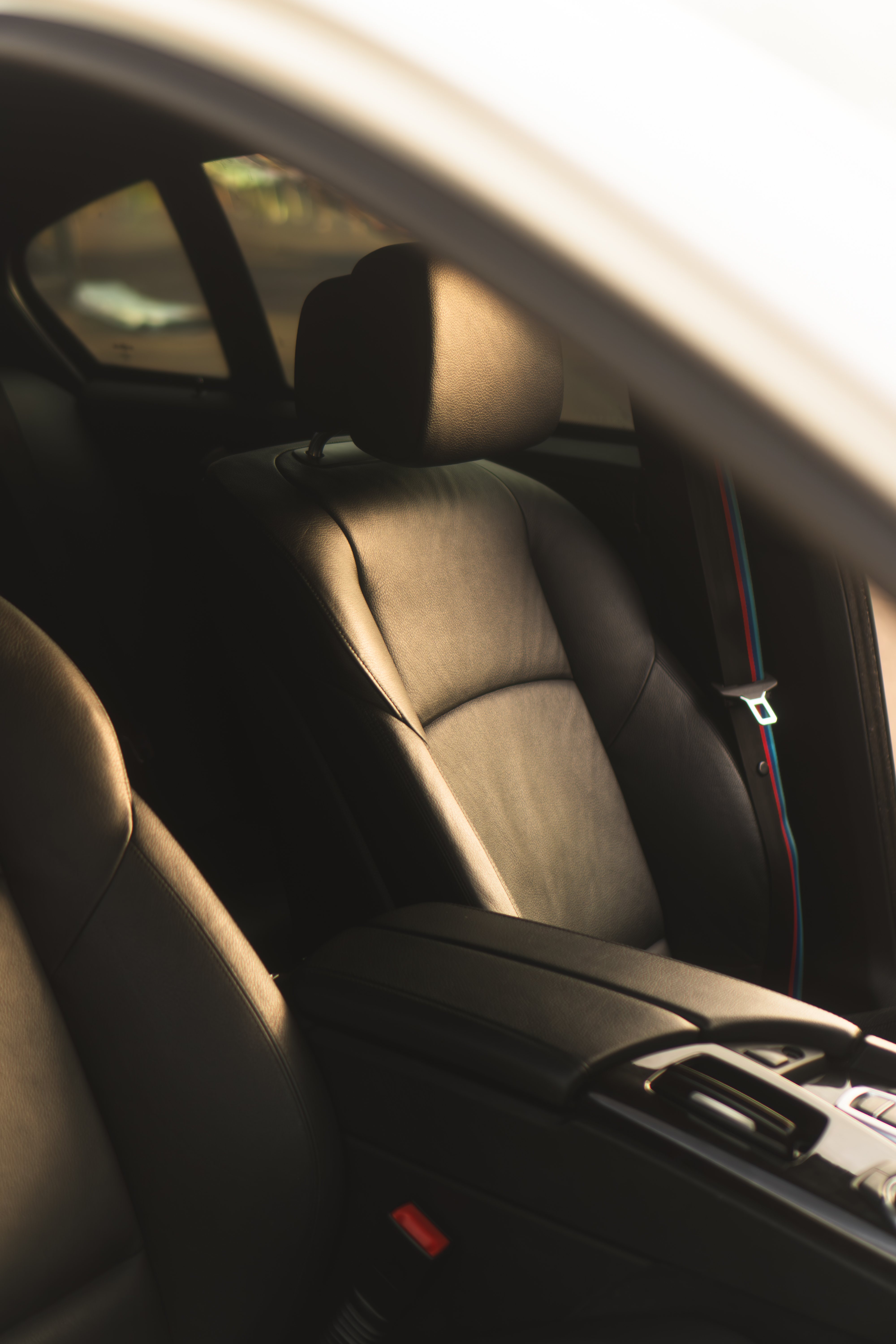 Bancos em couro preto com suporte lateral esportivo, cintos de segurança com as cores da BMW Motorsport. Cada detalhe reflete o cuidado e a atenção que este carro sempre recebeu.